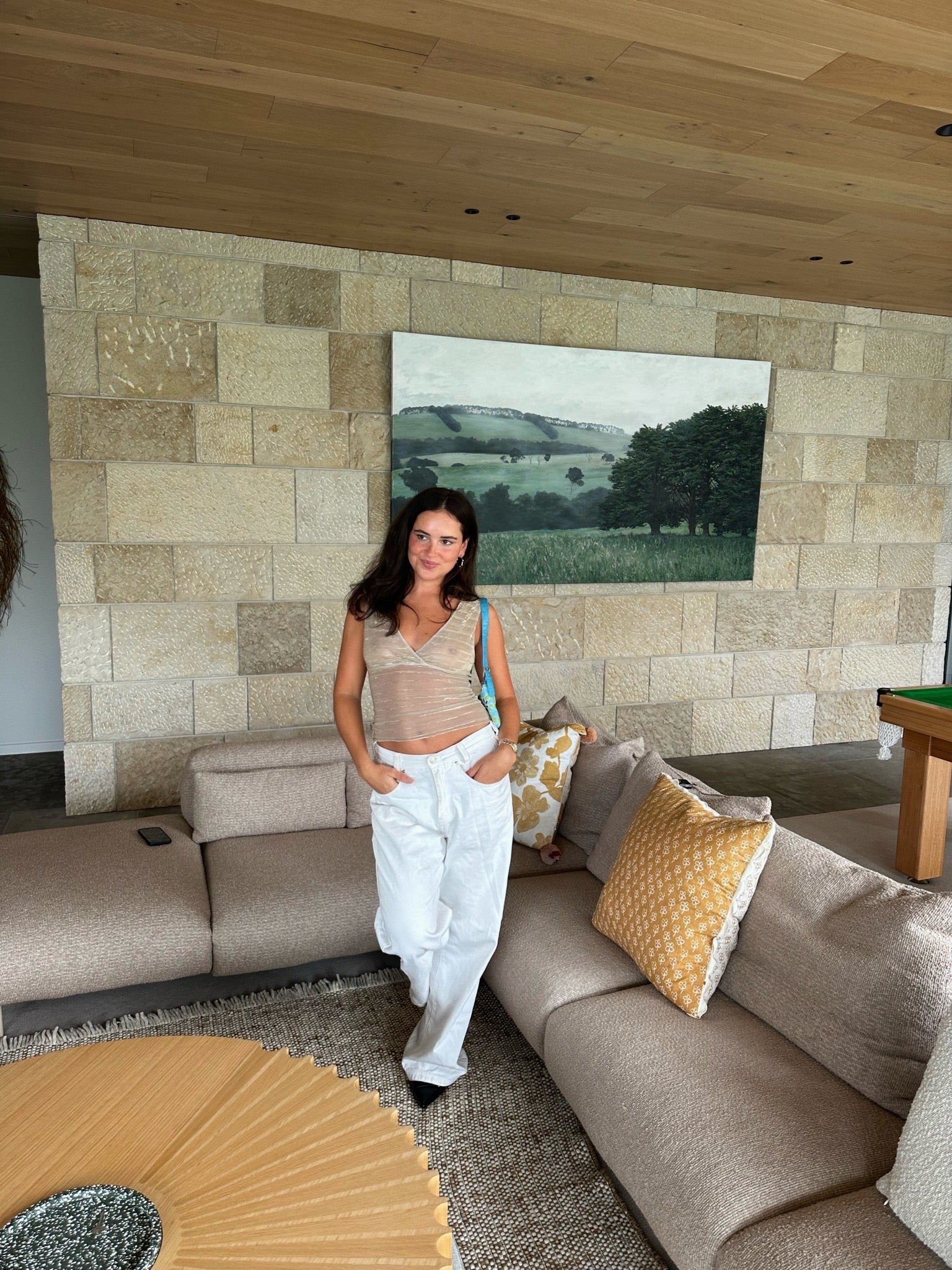 Our Astro Tank is a classic style tank top that features a small bust cross over. It is made from a gold metallic mesh fabric with a fair bit of stretch. The bust and back is double lined but is it quite sheer. The waist is single lined. This top is sewed with a seamless finish.