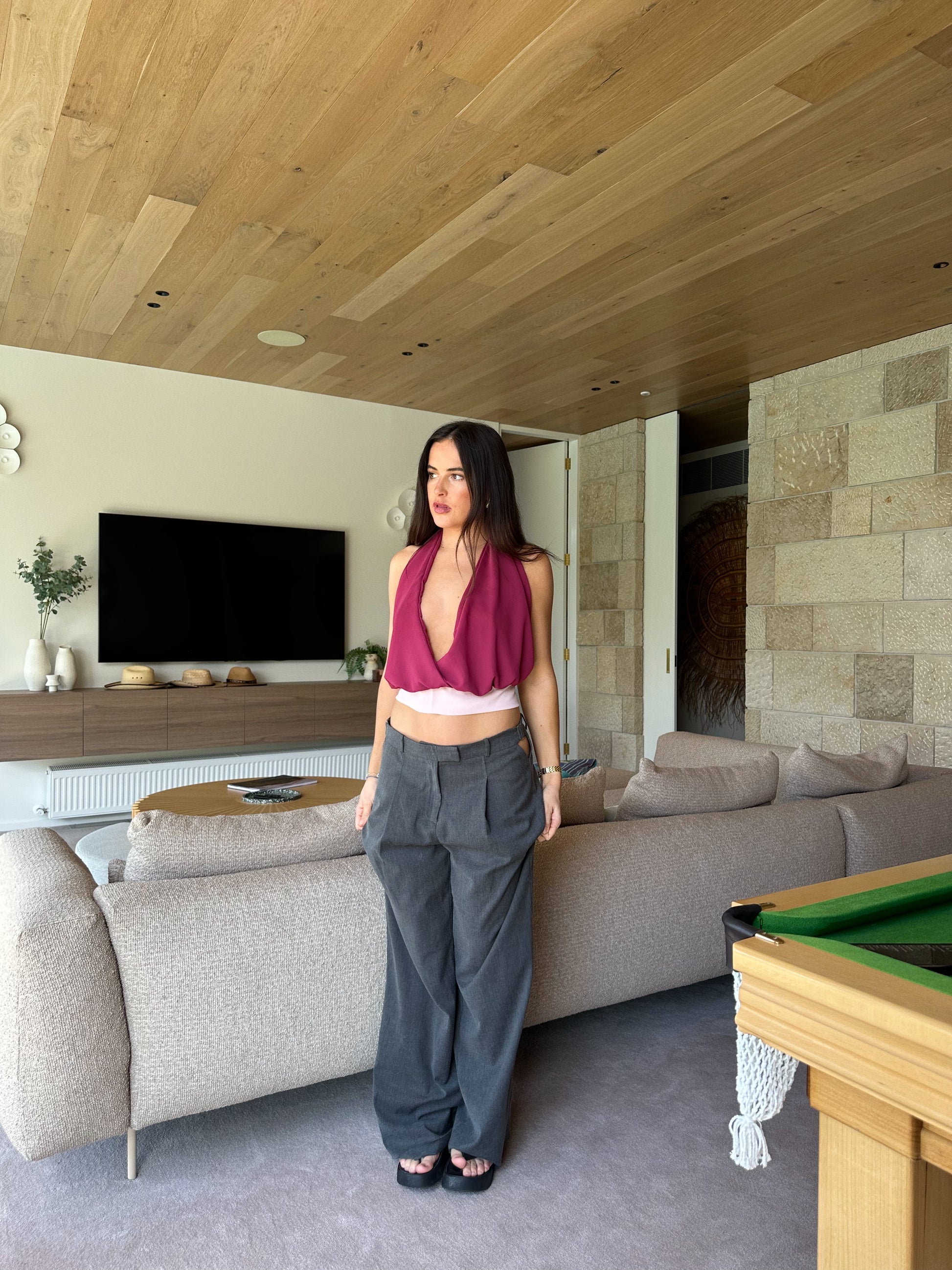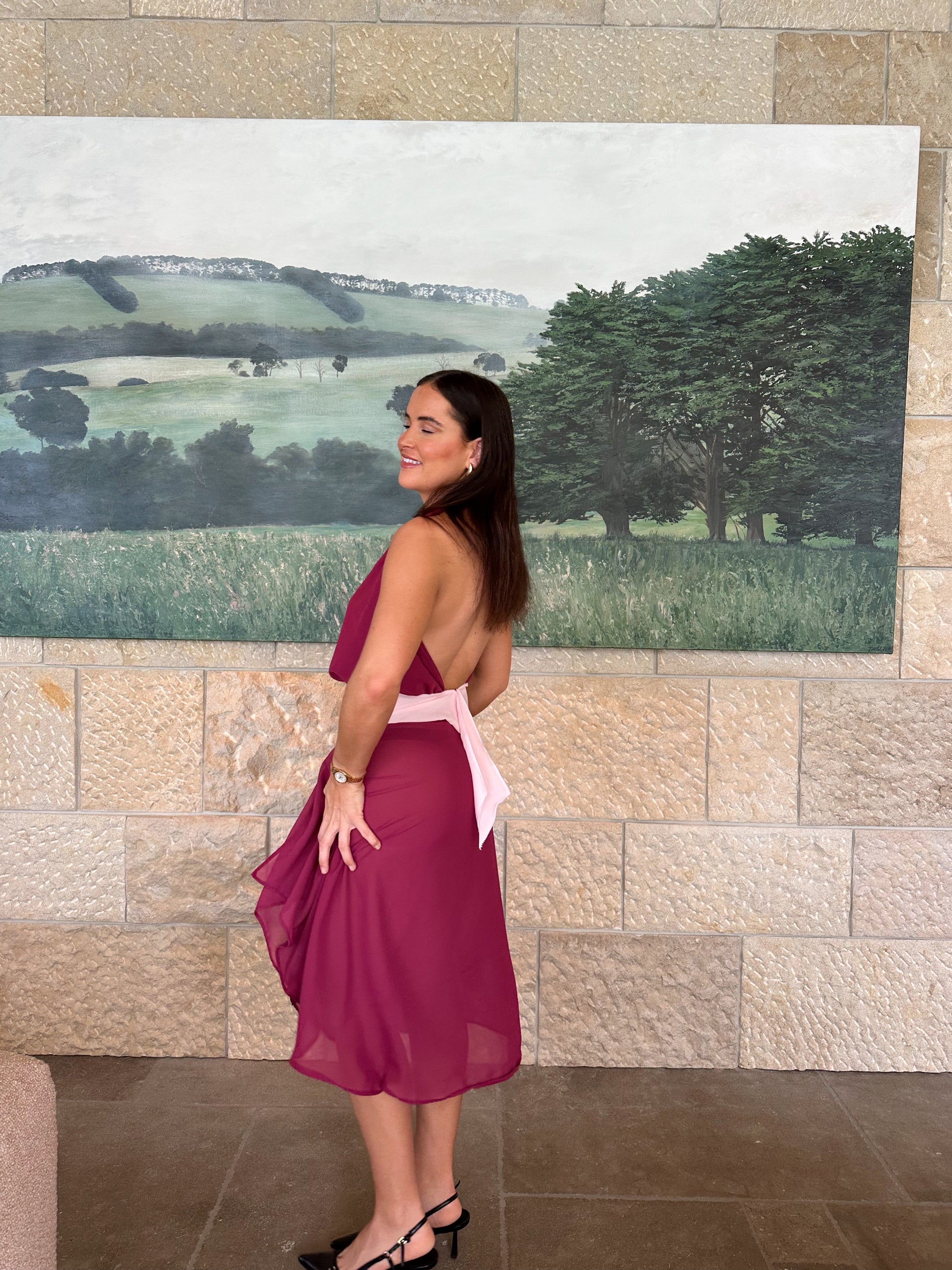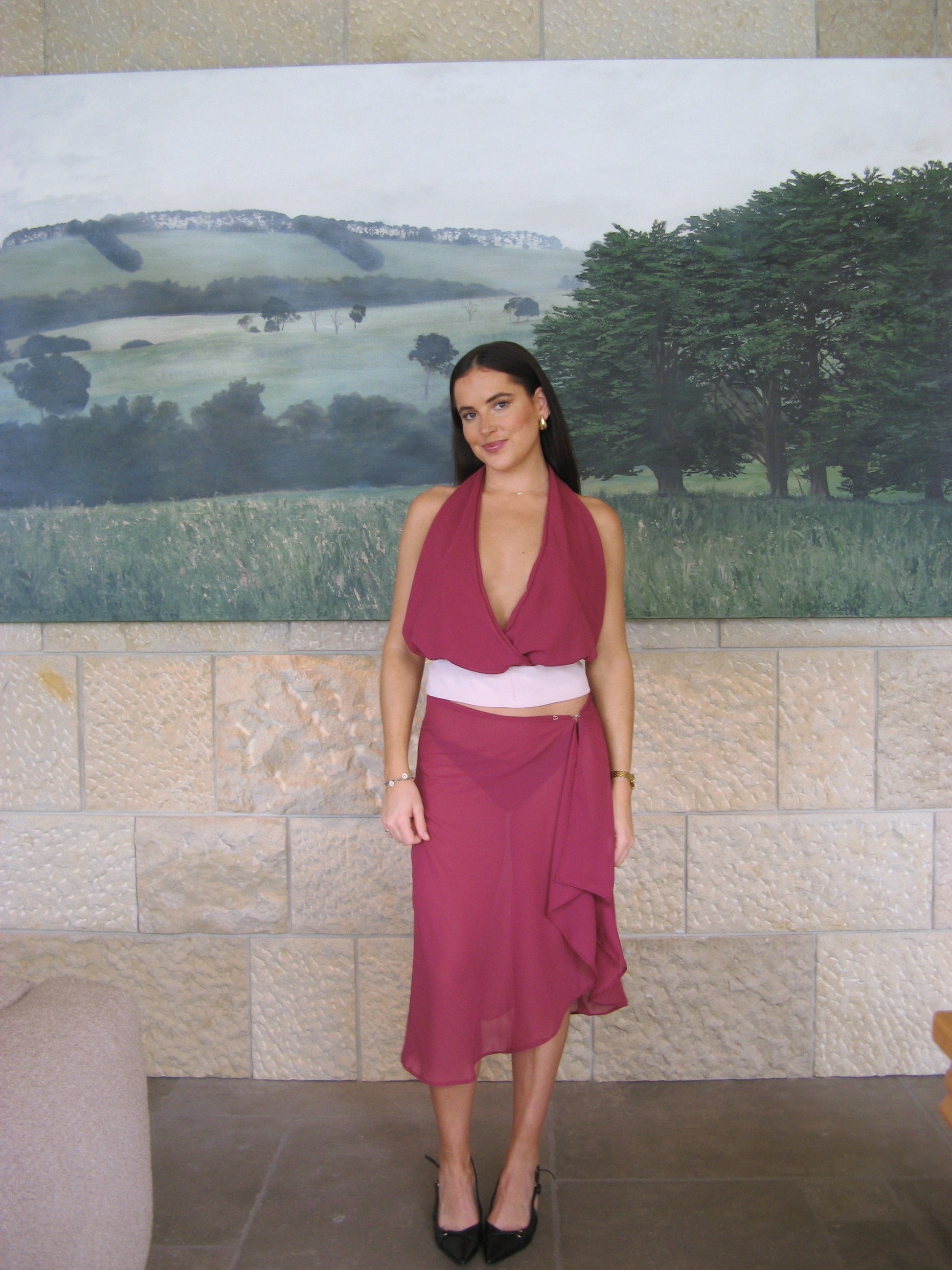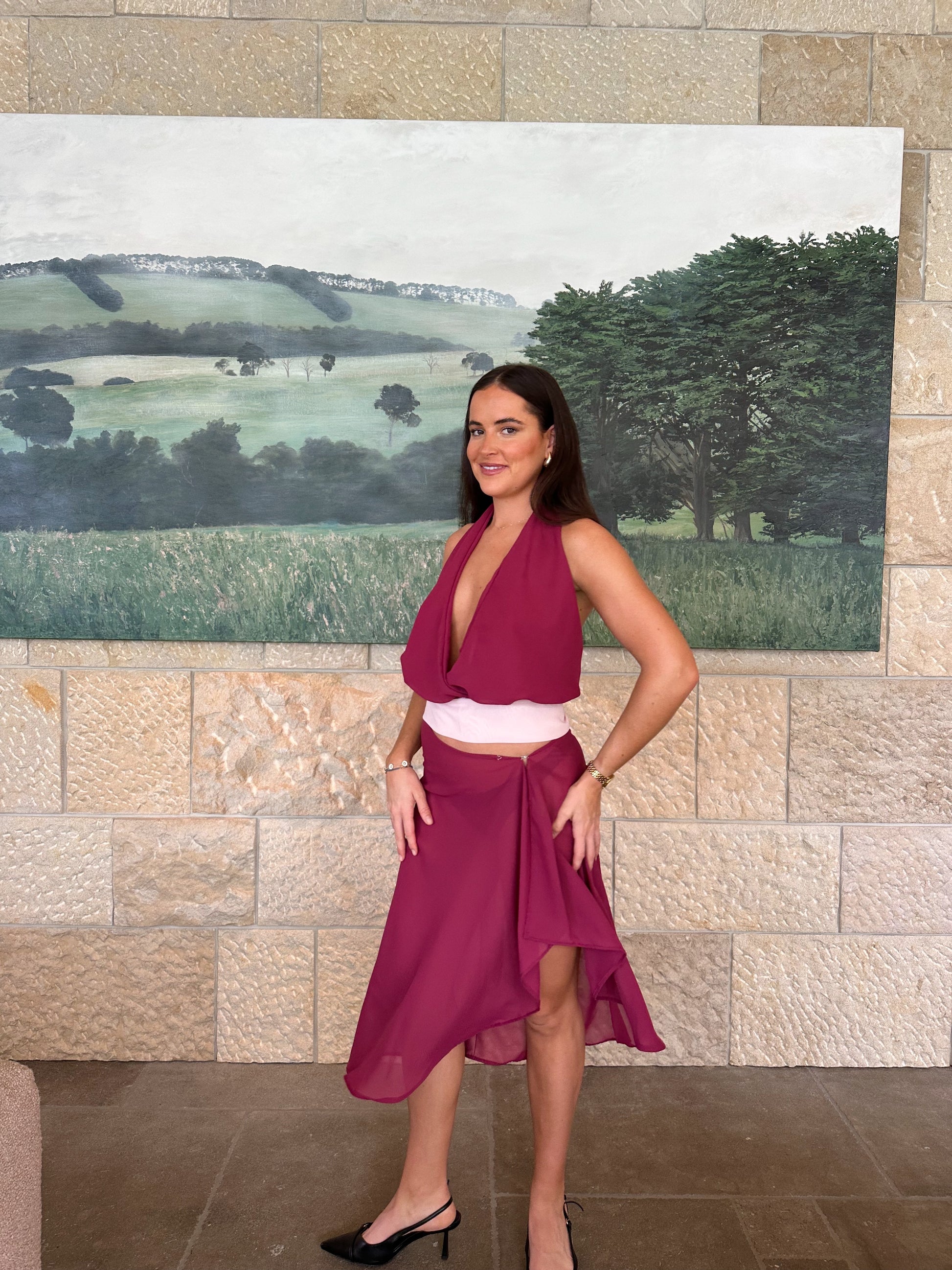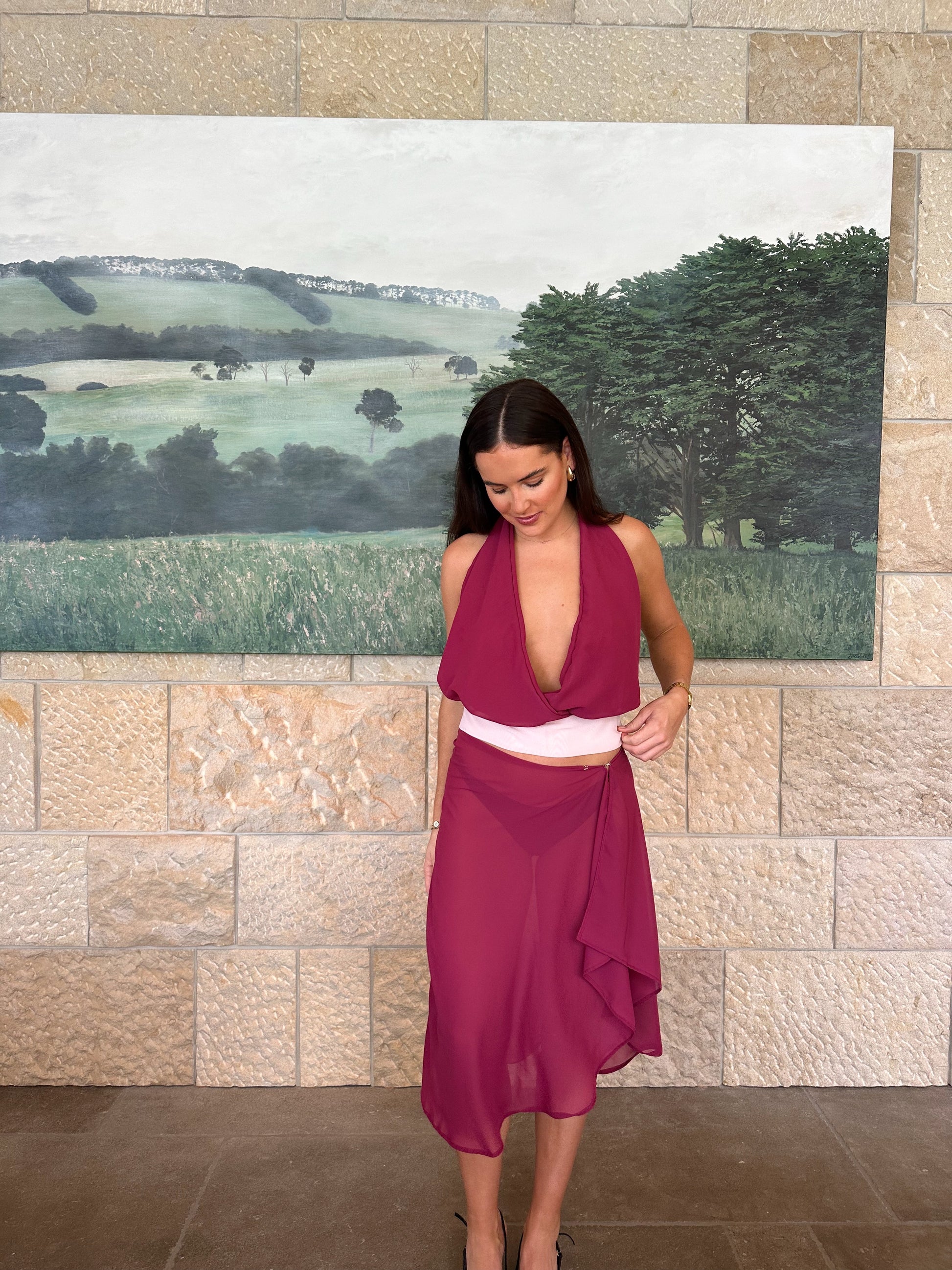 Our Esme halter is made from a pink and beaujolais chiffon fabric. The top is a halter style that drapes and crosses over the front and wraps around the back. It has a pink waist band with 2 adjustable silver hooks.