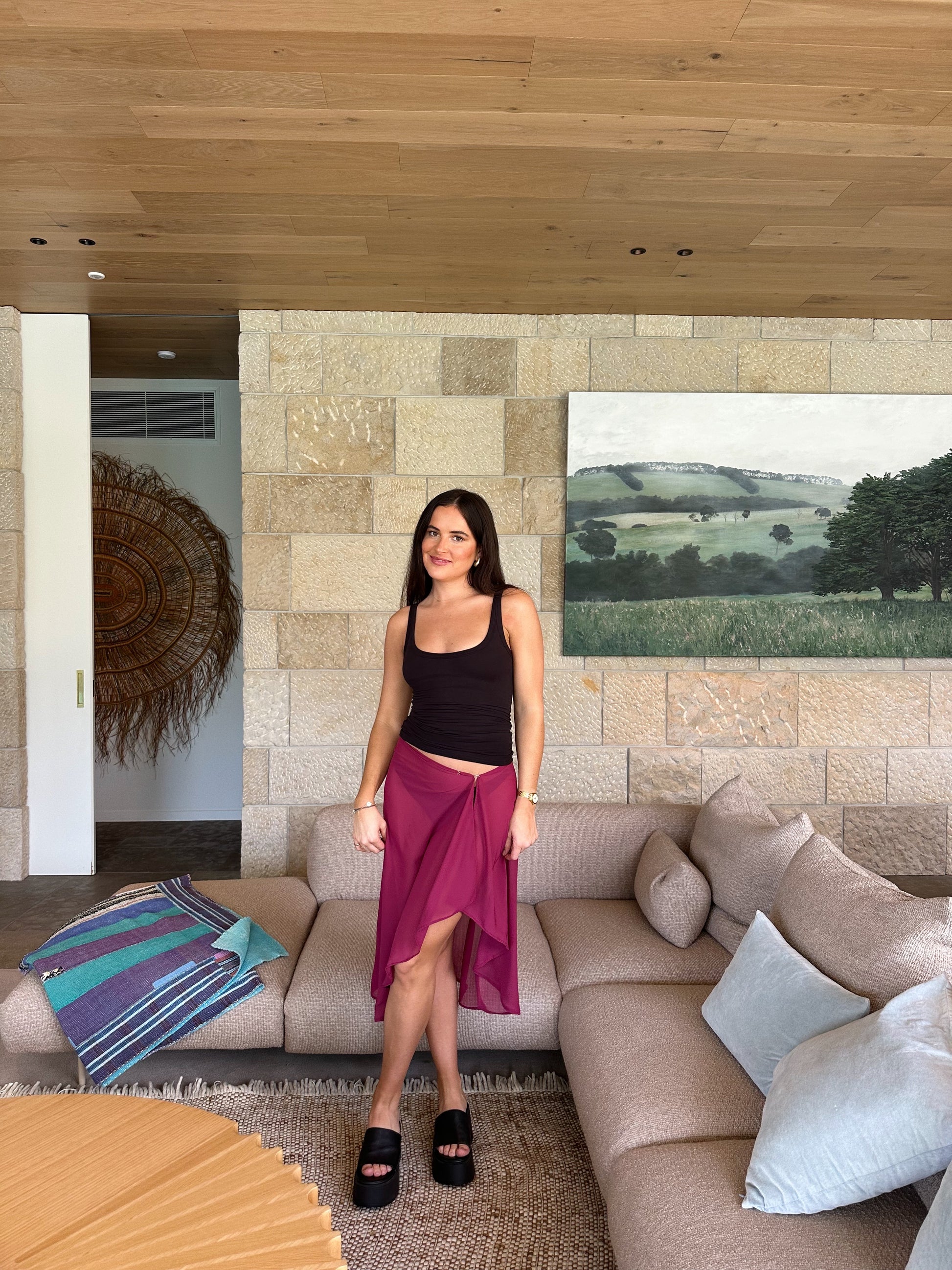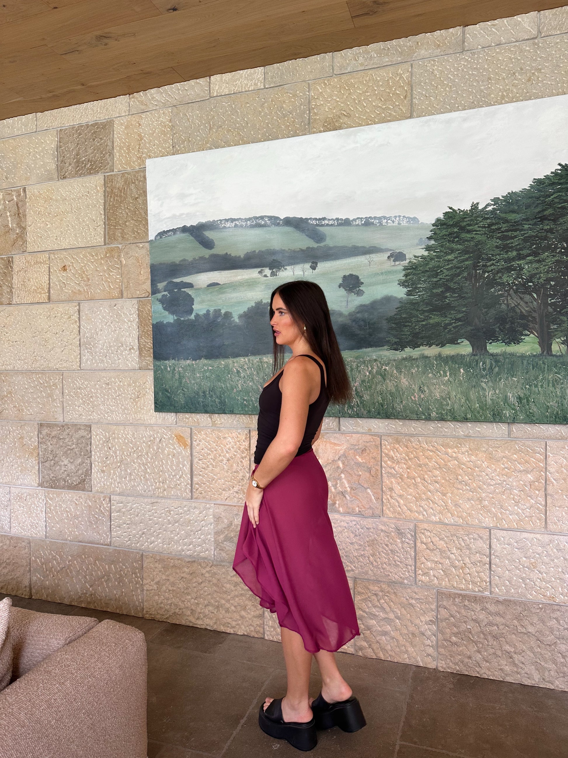 Our Esme skirt is made from a sheer beaujolais chiffon. It’s a single panel of fabric that wraps around your waist, similar to a sarong. It has a silver hook and eye and 2 different adjustable hooks.