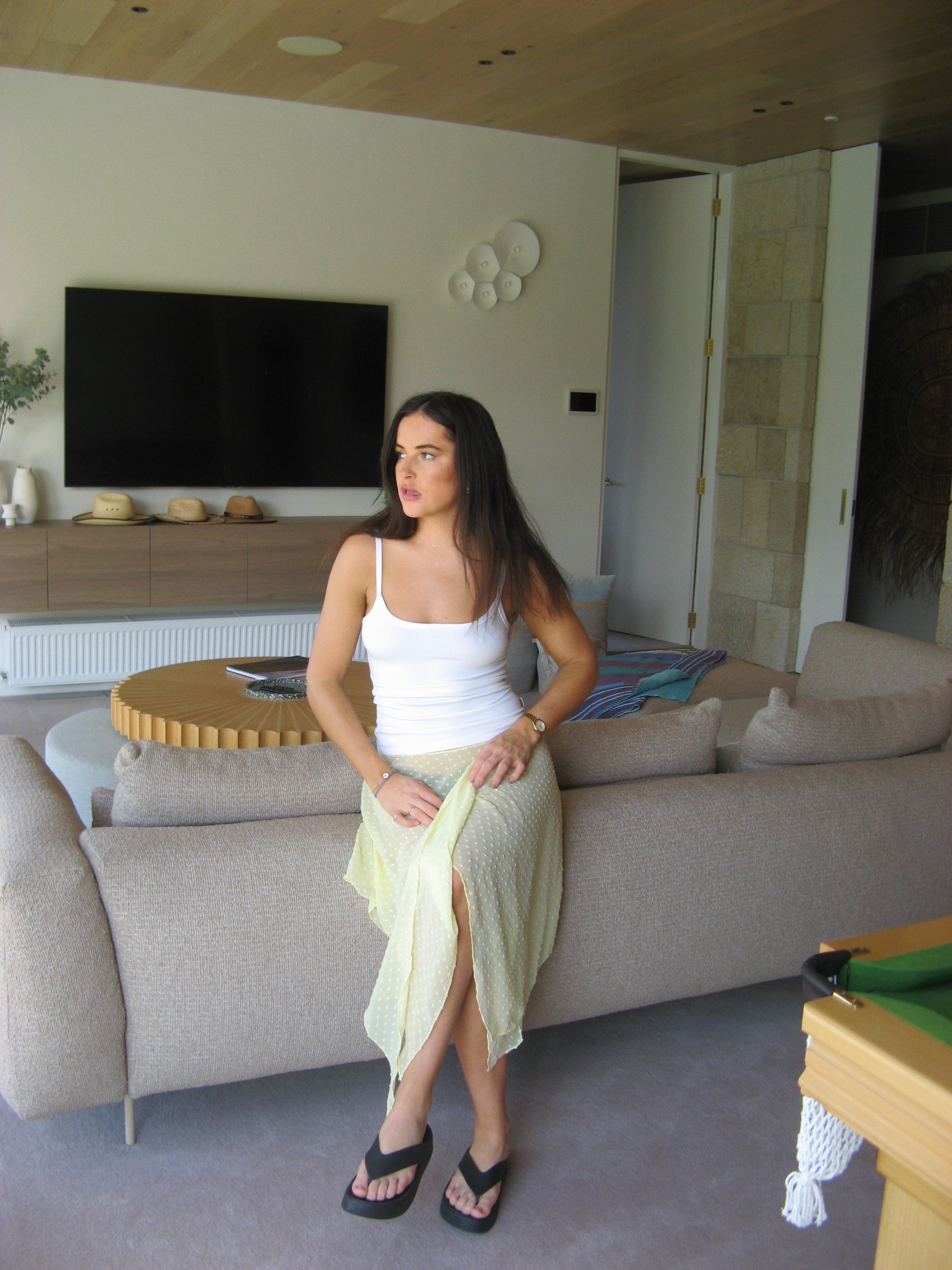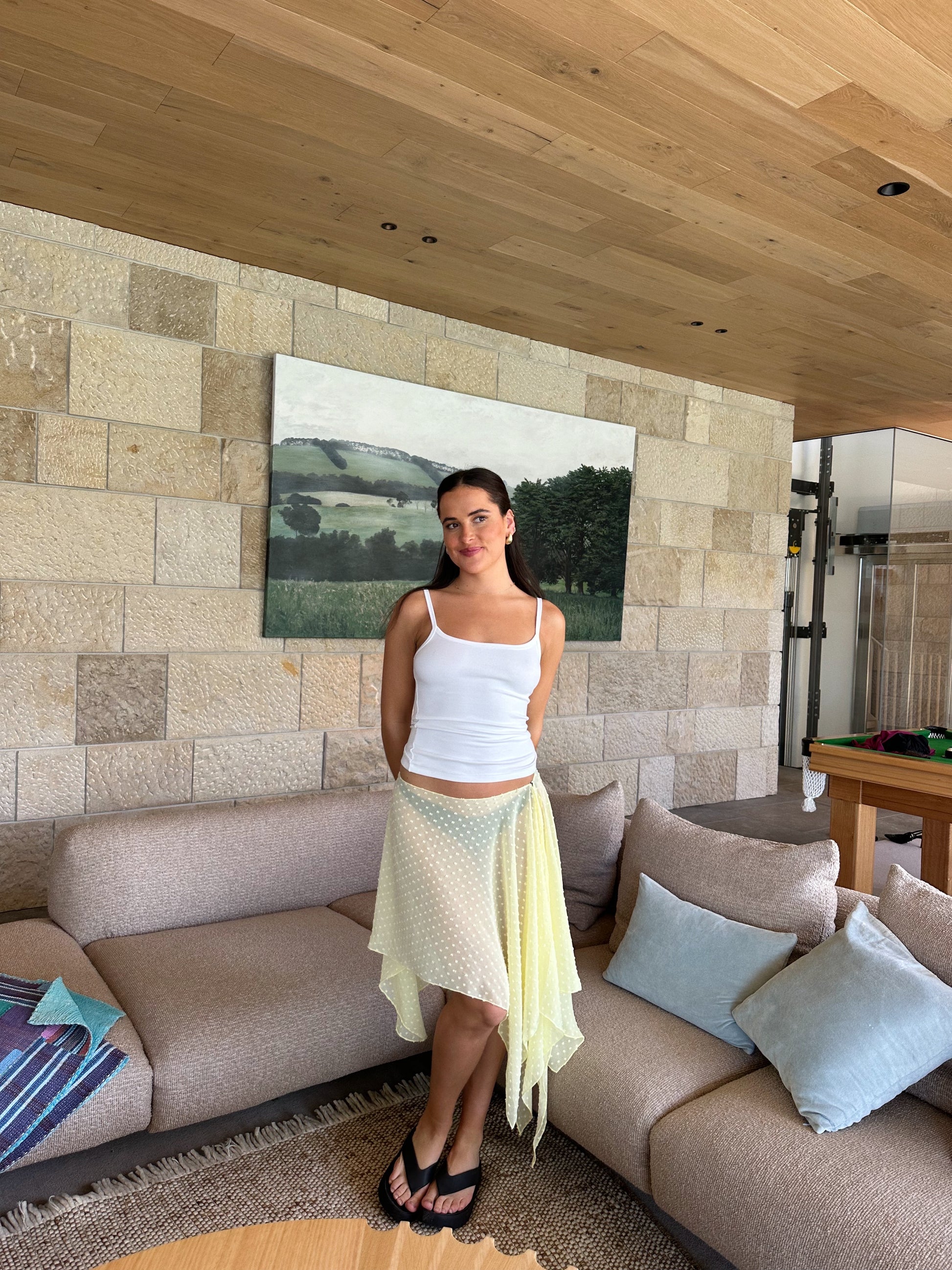 Our Leni skirt is made from a sheer Swiss dot chiffon. It has 2 asymmetrical panels of fabric that wraps around your waist, similar to a sarong. It has a silver hook and eye and 2 different adjustable hooks.