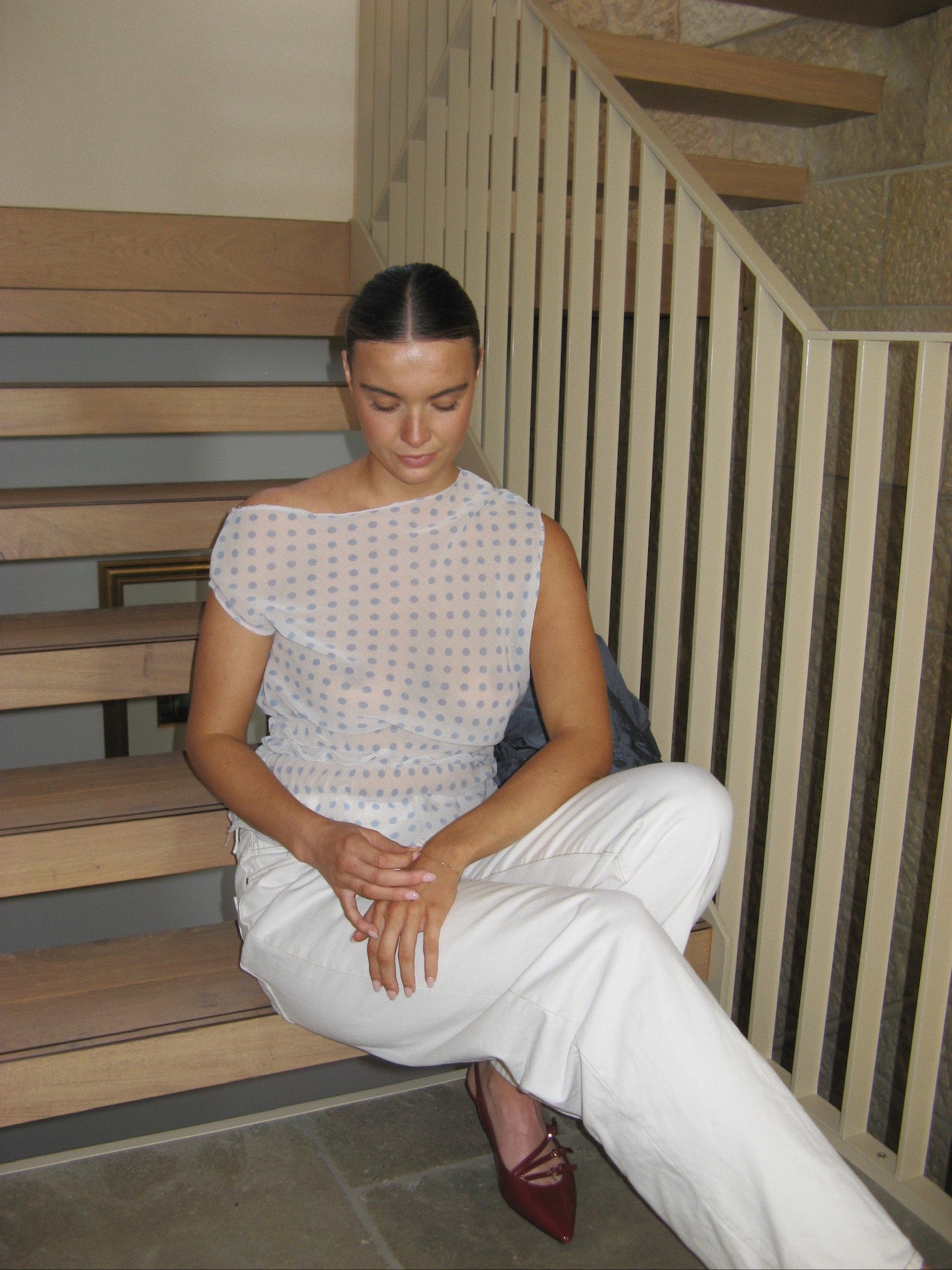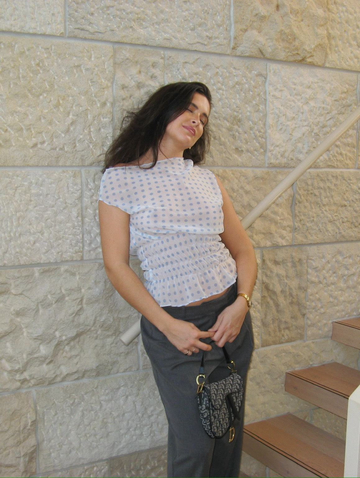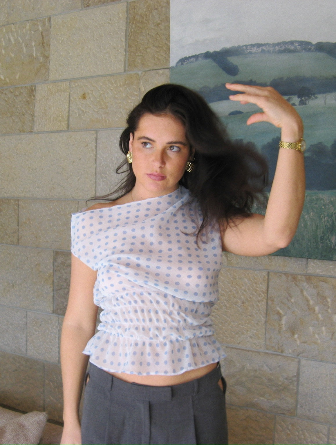 Our Lola top is the perfect light weight travel top for your euro summer trip. It is made using a semi sheer chiffon fabric with baby blue polka dots. Please note that once this item is sold out it will not be returning as it is made with a dead-stock fabric. It has elastic ruching around the waist and fits slouchy and off the shoulder.