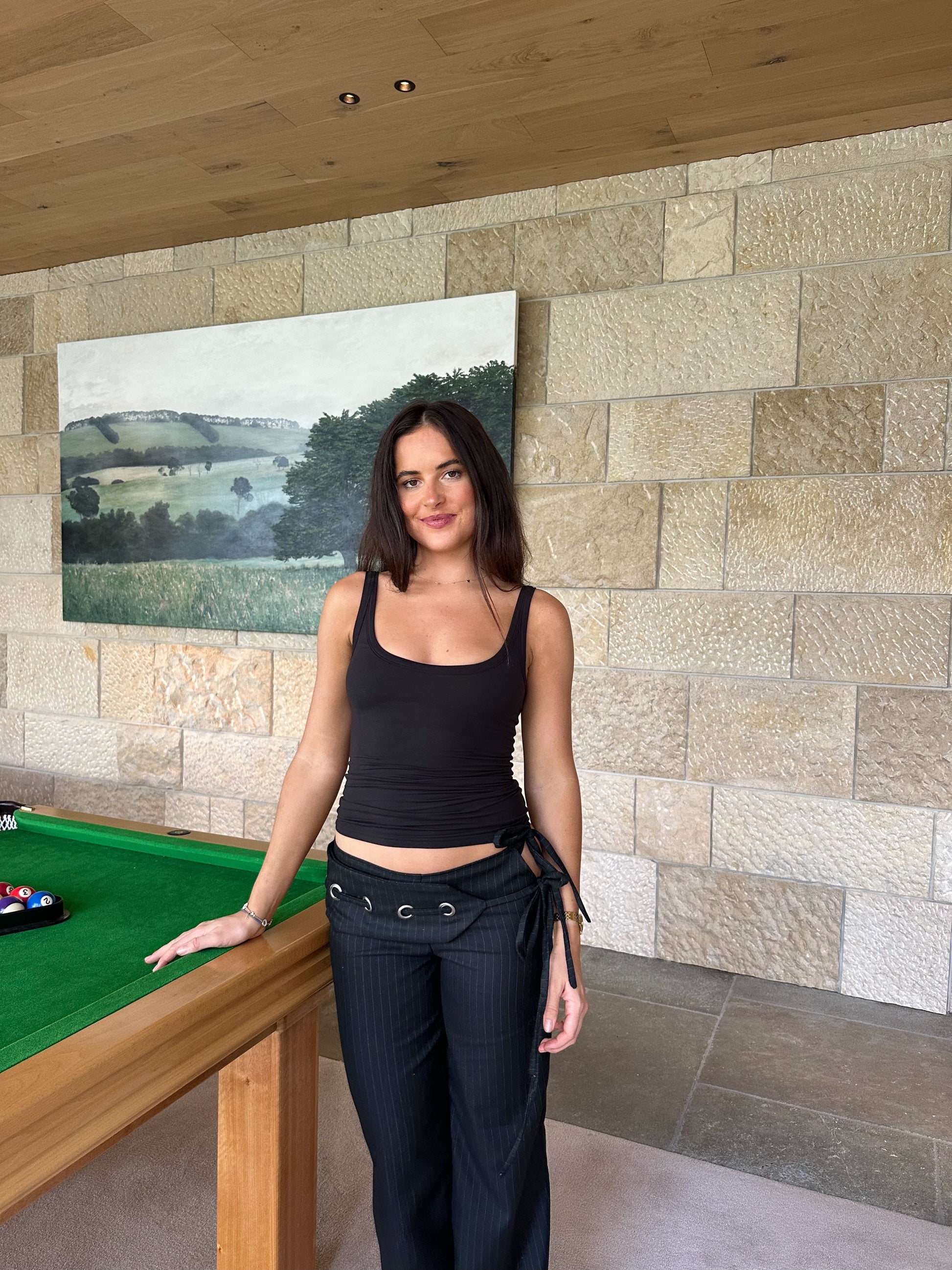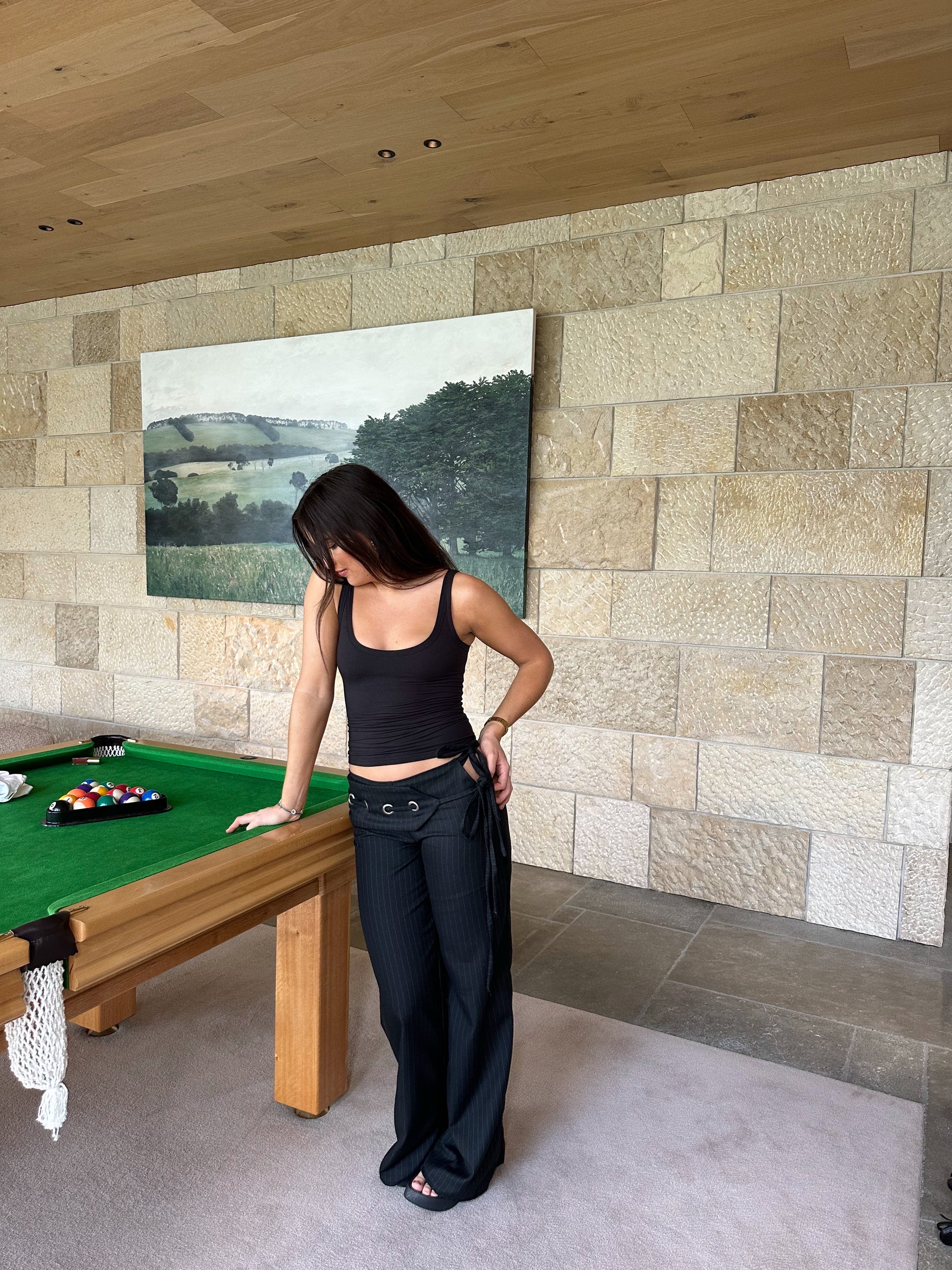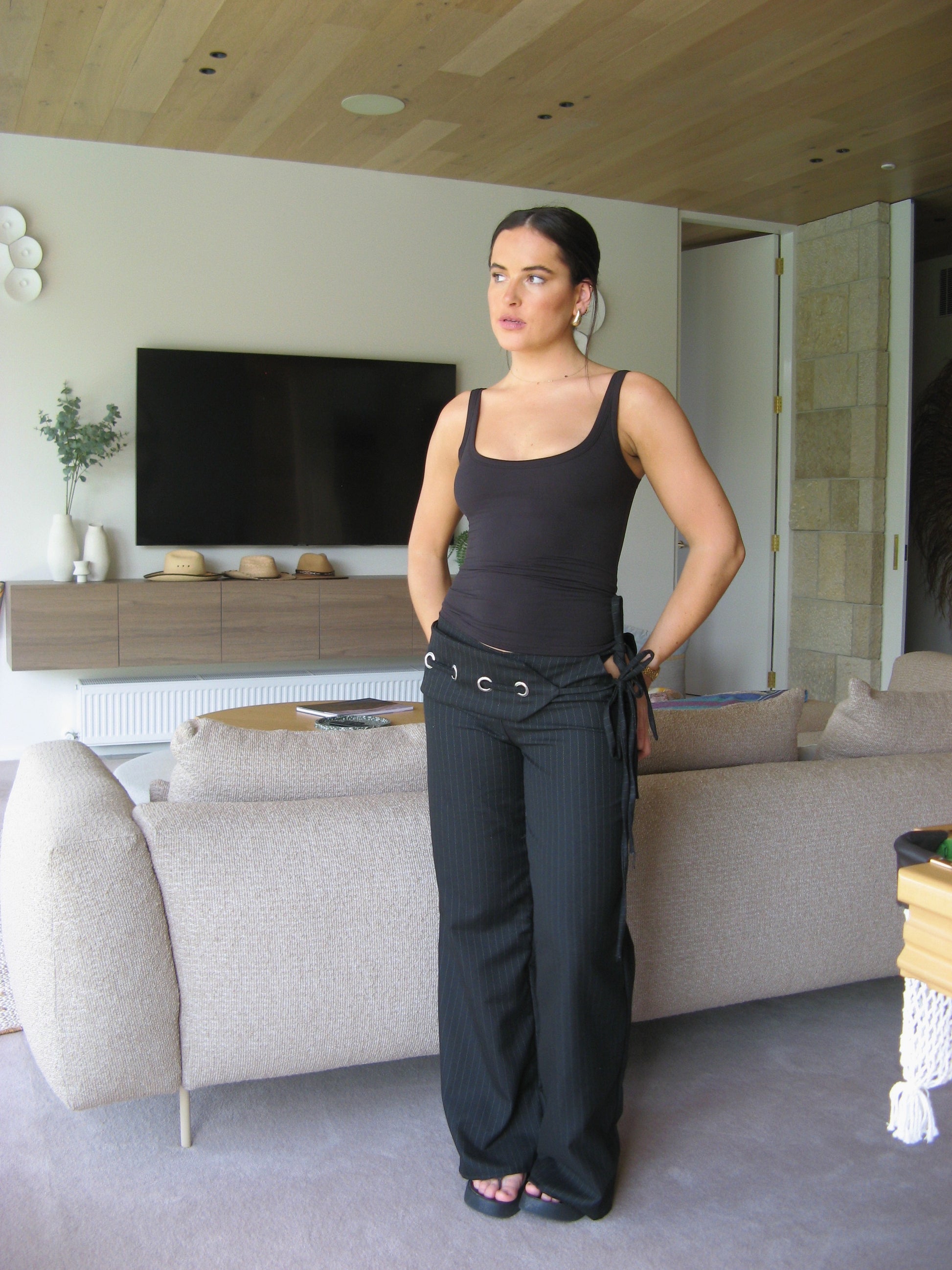 Our Luna pants are made from a pinstripe suiting fabric. They fit low rise and wide leg. They have an adjustable tie side with an open slit showing skin. It has an attached belt with silver eyelet detailing across the back and front. the belt has another adjustable tie side.